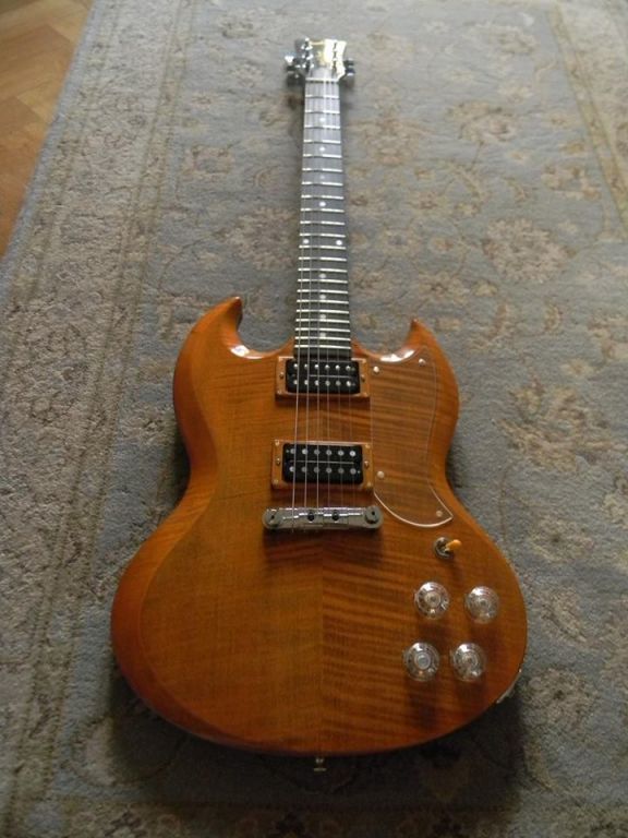 This is based on The Sinner model but has a tiger flame maple front with mahogany back and neck.