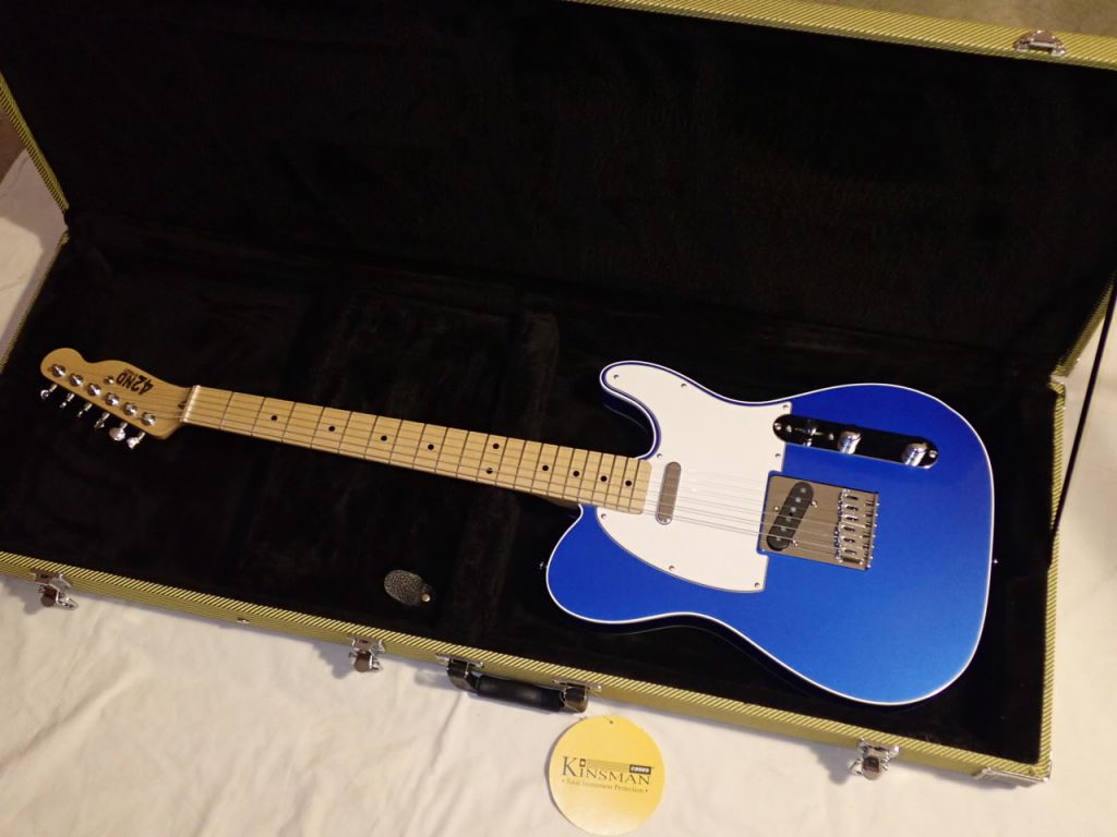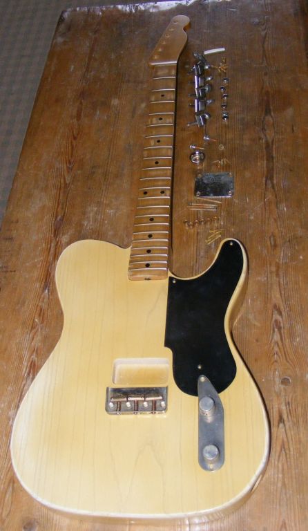 The 2nd kit was required as a heavy aged replacement Esquire body along with one piece vintage neck and nickel hardware. He chose a white pickguard for his project.
