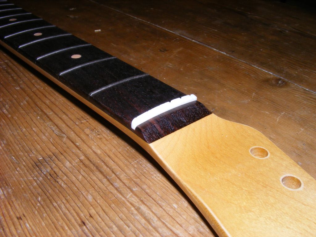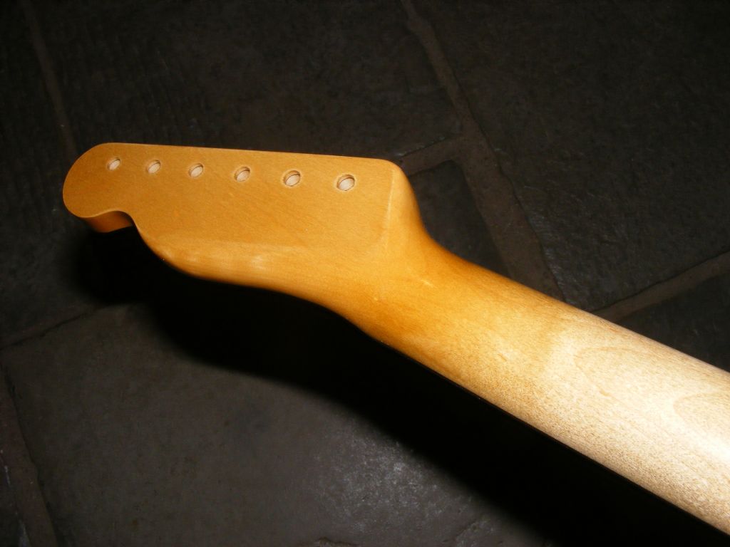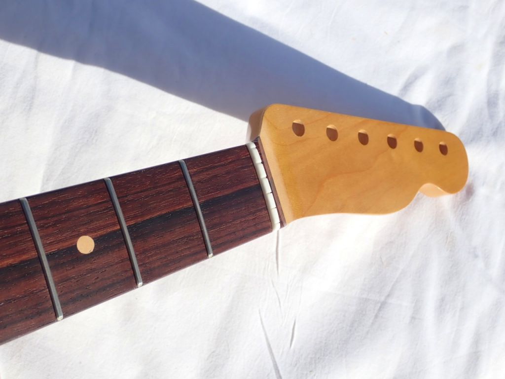 We've rolled the fretboard edges and added clay dots to this replacement neck finished in a light tint nitro.