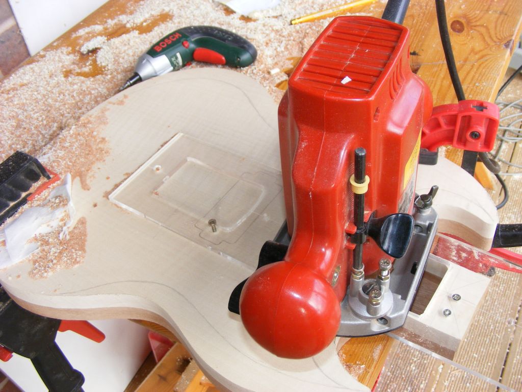Once the mahogany was glued up and left to dry, it was then shaped and routed for the controls required as well as chambered to create the semi solid body. The maple was joined, shaped and glued to the top and routed for top binding. It was then hand carved. The neck was shaped and test fitted.