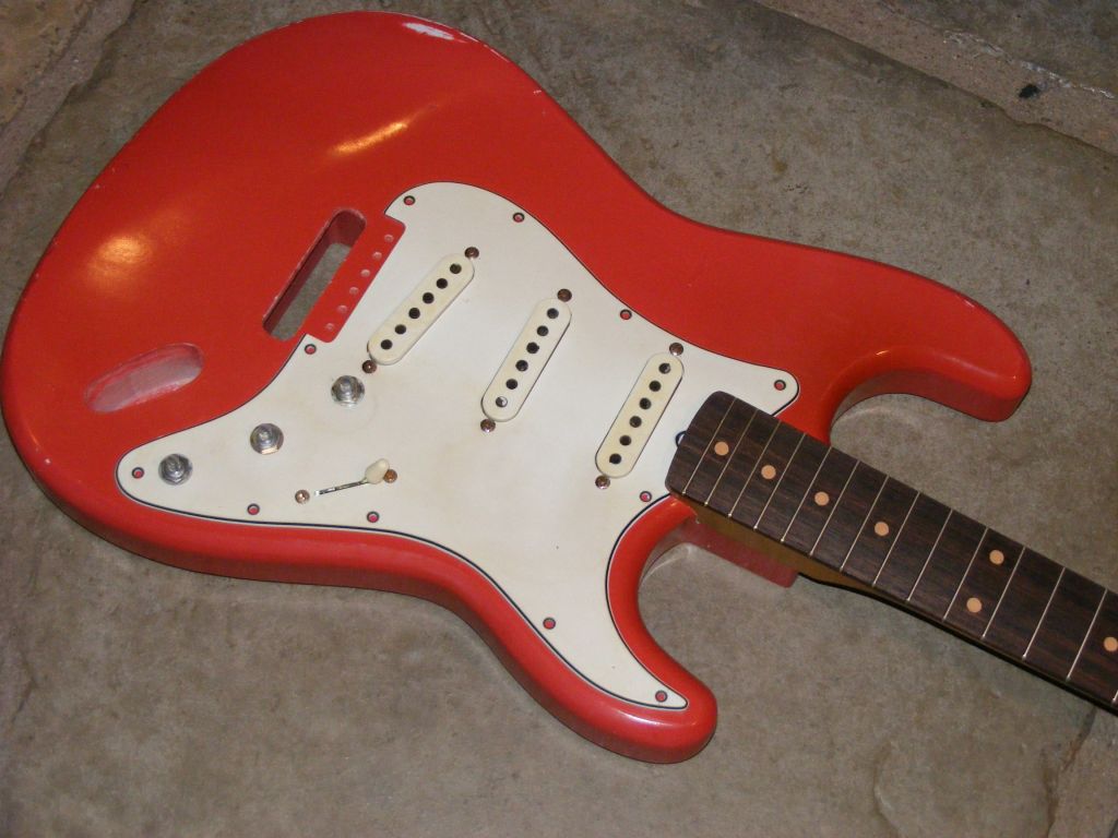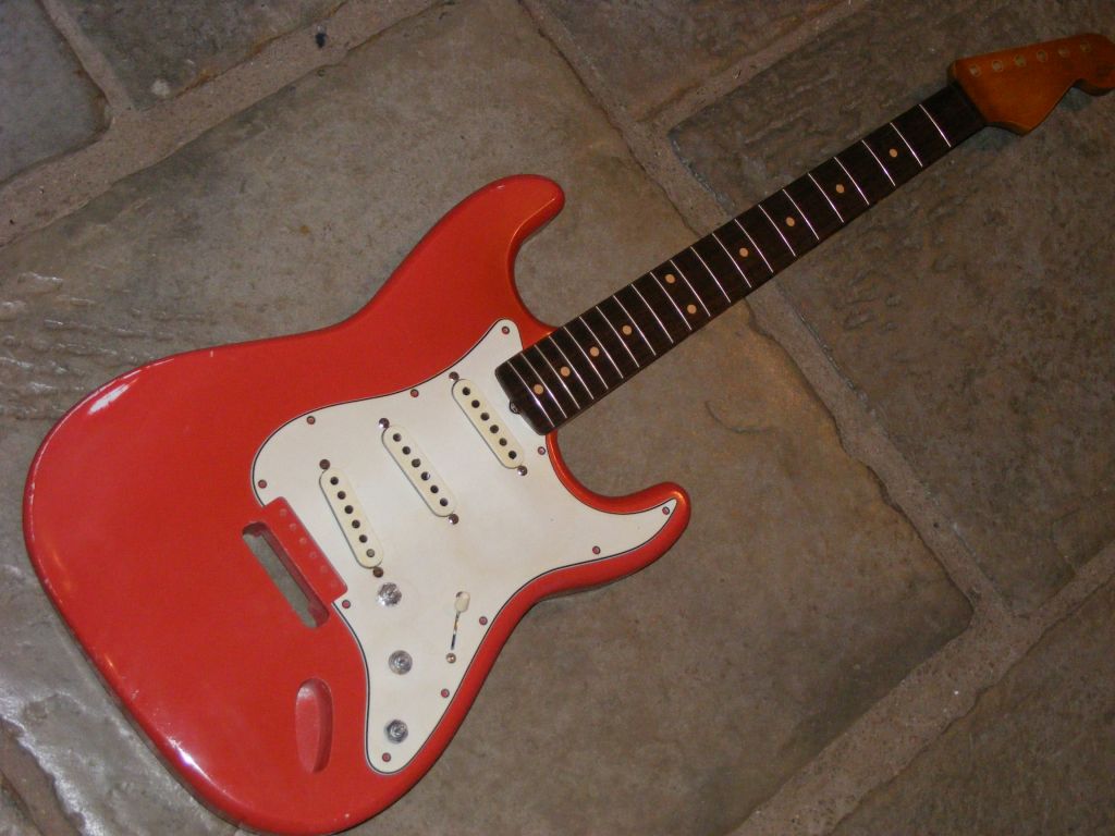 Also shown is a lefthanded replacement tele body in Olympic white and rosewood board neck.