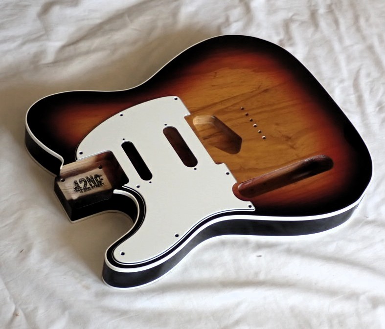 Once the neck is glued in, we will grainfill with black to enhance the stripes. The finish will be light orange/amber with dark brown back and neck