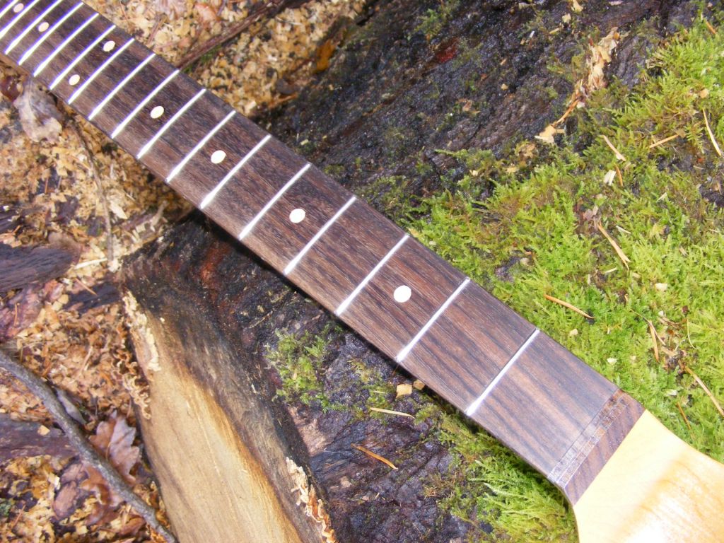 Hosco/Allparts maple neck with Rosewood fretboard, vintage frets and optional aged shrunken clay dots. 7 1/4" fretboard radius (10" also available). Tinted nitro finish with a choice of aging levels which can be seen on the neck page.